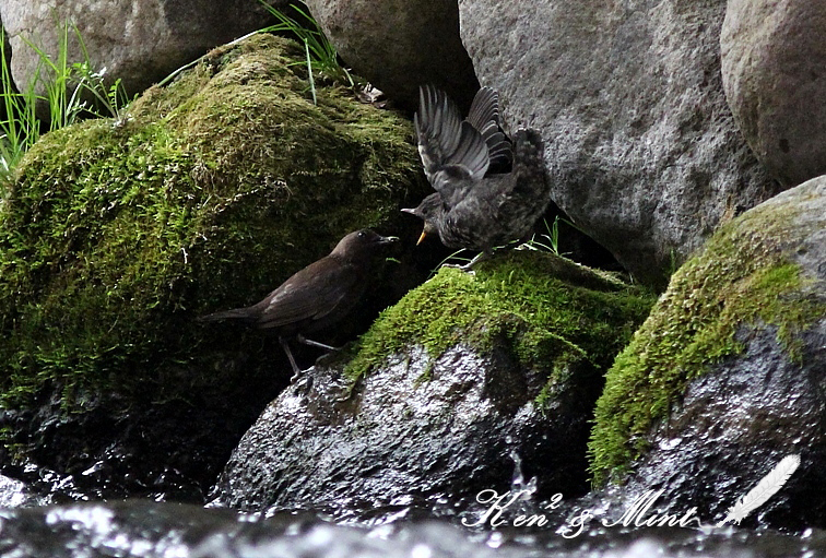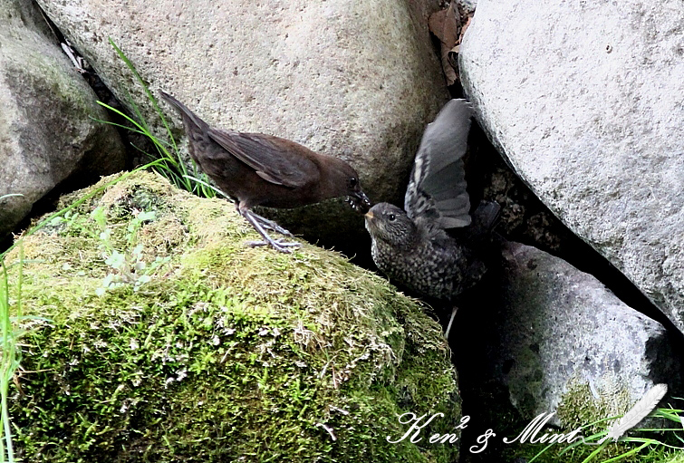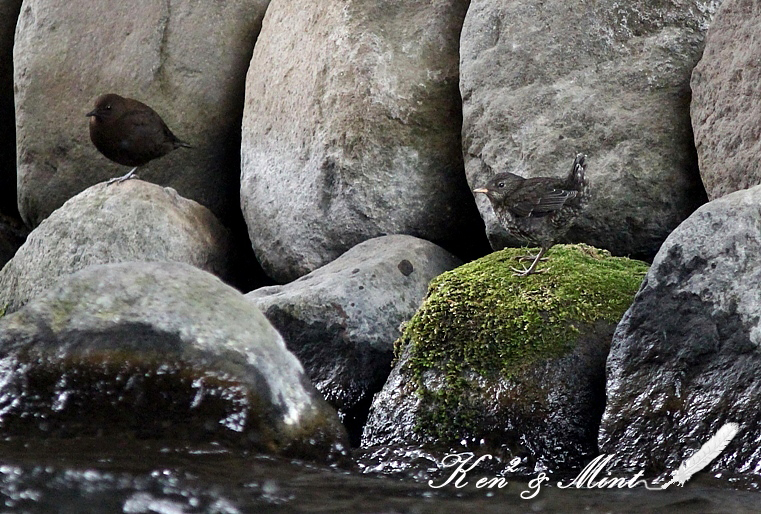 遠征地での事、この川でキビタキを撮っていたら、カワガラスが 30分に2回位は往復している事に気づいた。 「おかしいなぁ・・付けてみよう」と早速、カワガラスの方を見ると 口に餌を持っている。「おや?もしかしたら雛が・・巣があるのかしら?」 と行動を、ずーーーと見ていると・・ 「いました!いました!カワガラスの雛が(^0^)」 大きさは お母さんと、あまり変わらないように見えますが・・ まだ嘴は黄色く、親が来ると、ピーピーと餌をねだって いました。雛は成鳥よりも黒味があり、体に白い斑紋があります。 流水中の浅いところは歩いて採餌し、深い所は潜って採餌する。 水面を泳ぎながら首を水中に入れて覗き、餌を見つけると潜る。 この雛は親が来るまで静かに岩の窪みに隠れて待っていました。 左(成鳥)、右(幼鳥(雛)こんなに羽根の色も嘴の色も違うのですね! カワガラスは、「スズメ目 カワガラス科」で、全長21-23cm。 雄、雌、同色で、全身が黒褐色で足は銀灰色。虹彩は赤色。 テリトリーがあり、自分のいる場所を川の上流から下流まで巡回 して飛んでいます。 カワガラスの様子を見つからないように隠れて2時間位撮影していました。 ずーーーっと見ていても飽きないですね^^ こんなに大きくなっても、まだ親から餌をおねだりするのですね^^; ※続きは また後日アップします(*^^*) 撮影日:2011年05月03日 撮影者:By Mint 野鳥ブログに参加しています。 1日1クリックのご協力お願いしますm(_ _)m |