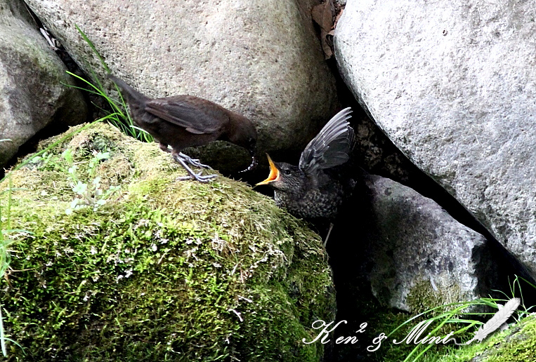 昨日の続きの画像です^^ 8mも離れていない場所に、カワガラスの幼鳥(雛)に出会いました。 いつものカワガラスにしては・・色や柄がおかしい・・(??) この子は、さっき餌をおねだりしてしていた雛さんかなぁ? 営巣の場所から3M位離れた石の上にいました。 「お母さん、帰ってこないかなぁ?」 「お土産捕まえたかなぁ?」と回りをキョロキョロしています。 私も一緒になって・・左右をキョロキョロ(^^; お母さんが戻って来ました。いつも、この巣が無い方向に飛んで行きます。 誰もいない事を確認すると、段々と この巣の方に近寄って来ます。 すごいですねーーー!敵から守っているのですね! ダイレクトに巣には戻って来ないようで、何回も巣を通り過ぎて 別の方向に飛んで行った、ふりをしていました。 「お母さん♪早く頂戴~♪」 「もう・・・・しょうがないわねぇ!」と餌を雛に口移しで上げています。 親の嘴を食べちゃう勢いで、大きな黄色い嘴を開けて親から 餌を貰っていました♪ 抱卵は雌が行い、雄は巣の見える所で監視してする。 雛は約19日で孵化(ふか)し、雌雄に養われて約22日で巣立つ。 人間界より自然界の巣立ちは早いのですね!(++) 採餌は、流水中の浅いところは歩いて採餌し、深い所は潜って採餌する。 水面を泳ぎながら首を水中に入れて覗き、餌を見つけると潜る。 水生昆虫を食べるが主にトビケラ類、カワゲラ類、カゲロウ類 などの幼虫を好む。小さい魚なども捕らえる。 トビケラ類の幼虫を巣から掘り出したりする。 繁殖期には潜るほうが多く、非繁殖期には歩いてついばむ方が多い。 撮影日:2011年05月03日 撮影者:By Mint 野鳥ブログに参加しています。 1日1クリックのご協力お願いしますm(_ _)m PR |