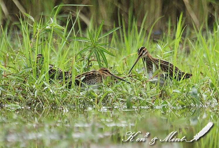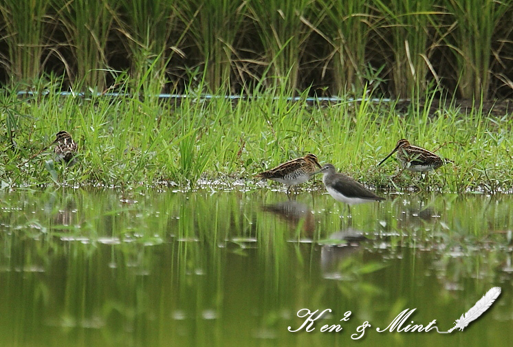 シギチは本当に判定が難しいですね・・(^^; この子は「タシギ」さんです。タシギさん特有の羽の裏の模様 と色でした。 羽の裏に綺麗な鱗状の模様があればジシギです。 またオオジシギとチュウジシギとは尾羽の枚数が違うみたいですが その写真を撮っておかないと枚数までは確認出来ませんね(^^; また鳴き声が違うので鳴いている場合は覚えておくか動画を 撮っておくといいですね(^^; この子は数日前から入っていましたが羽の裏の模様を確認する 写真が無かった為、再度撮影して来ました。 タシギさんは「チドリ目 シギ科」の鳥さんで全長25-27cm位 翼開長すると44-47cm位になります。♂、♀ 同色で、嘴が長く 尾は短め、体は太めで黒褐色と黄褐色のまだら模様。 お腹は白っぽく、胸にも沢山まだら模様がある。 飛んだ姿では、次列風切の先に白線が出る。 これは、他のジシギ類には見られない。足は黄緑色か灰緑色。 タシギさんは羽根の裏がグレーの帯状の線があり付け根に 模様が残る。 ケンケンが撮影した同じ休耕田にいた「チュウジシギ」さん とは羽の模様が違います! 長い嘴を泥の中に刺して忙しそうに、餌を食べていました。 ジシギさんよりタシギさんの方が嘴が長いです。 水に映った稲穂とタシギさんの姿が綺麗でした。(*^^*) タシギさん、この日は3羽確認しました。 手前に、クサシギさんが・・・(^^; 邪魔だわぁ。。。 派手な色とタレ目の「タマシギ」さんも綺麗だけど、地味な色 ですが、ウリ坊色の「タシギ」さんも、とっても可愛いと思いま せんか?私の大好きな鳥さんです♪ 「マ」が入ってないだけ?・・・名前が・・(^^;マヌケ?? 3羽で忙しそうに採餌してました。 台風が来るけど・・・大丈夫かしら? ちなみに前日8月30日は〇〇回目のkenkenの誕生日でした♪ 撮影日:2011年08月31日 撮影者:By Mint 野鳥ブログに参加しています。 1日1クリックのご協力お願いしますm(_ _)m PR |