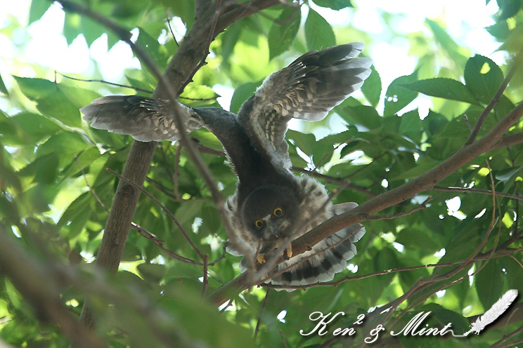 この日、7箇所目のアオバズクを探しに出かけました。 いつもはケンケンが見つけるのですが・・ かなりアバウトな情報で・・場所が判らず二人で手分けして 歩いて探しました。 そして、ついに私ミントが大きな木に止まっているアオちゃんを 見つけました(^^)v早速ケンケンへ電話♪ このアオバズクはリッチで、大きなお屋敷に住んでいました。 そんな顔で睨まないでよう~(^^; ケンケンが動くたびに、この子は目で追っていました。 7箇所目のアオバズクでした^^ 自分で探して見つけるのは大変ですが楽しいものですね^^ 撮影日:2011年07月23日 撮影者:By Mint 野鳥ブログに参加しています。 1日1クリックのご協力お願いしますm(_ _)m |